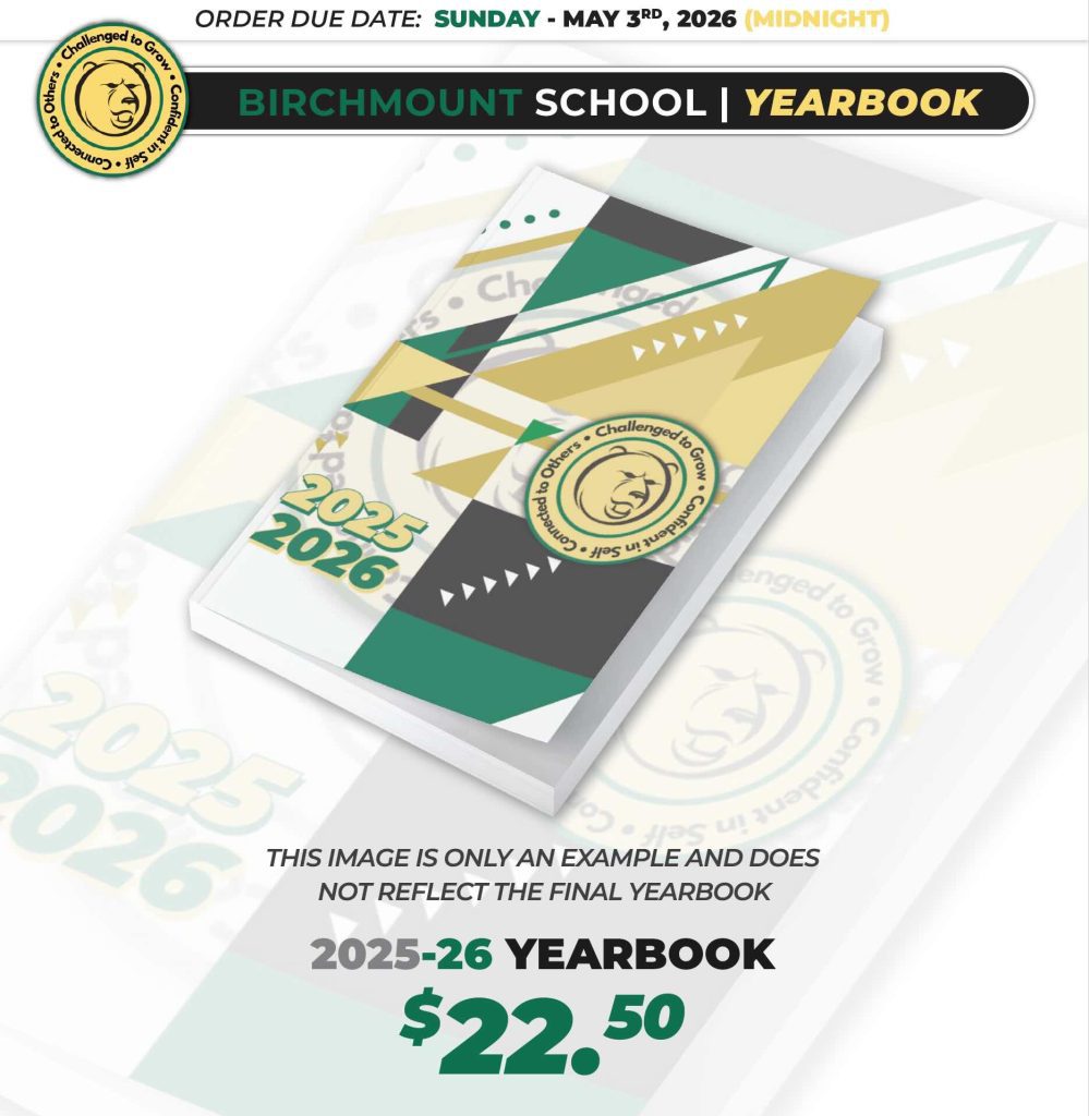 Yearbook Orders can be made by visiting this website: https://teamandspiritwear.com/BIRCHMOUNTYEARBOOK/shop/home