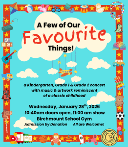 January 28 at 11:00 AM – A Few of Our Favourite Things! – Performances by all Kindergarten, grade 1 and 2 students