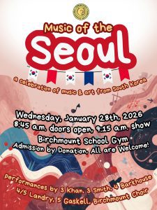 January 28 at 9:15 AM: Music of the SEOUL – Performances by 3 Smith, 3 Khan, 4 Barkhouse, 4/5 Landry and 5 Gaskell